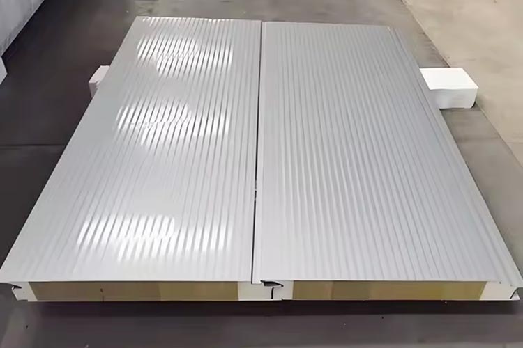 Die Verkleidung der Steinwolle-Sandwich-Wandplatte besteht aus hochfestem, vorbeschichtetem Stahlmaterial, das eine gute Korrosionsbeständigkeit bietet und der Erosion von Wasserdampf, Säure und Lauge sowie anderen Substanzen in der äußeren Umgebung widerstehen kann.