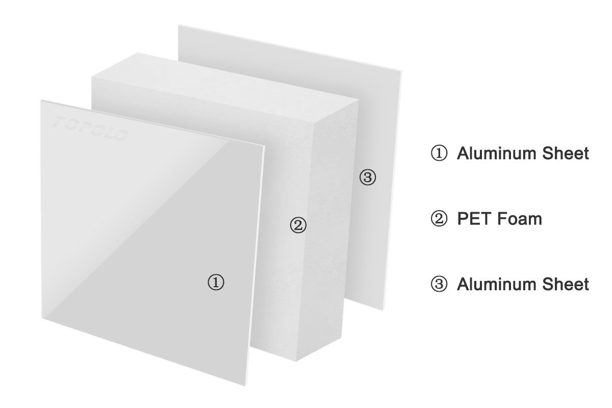 - Hohe Festigkeit: Der PET-Schaumkern bietet eine gute Druck- und Scherfestigkeit, und die Sandwichstruktur aus beidseitigen Aluminiumhäuten und dem PET-Schaumkern in der Mitte verleiht der Platte eine hohe Gesamtfestigkeit.