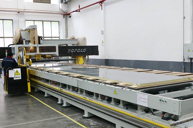 Neben der Auswahl hochwertiger Schaumkernmaterialien und Aluminiumlegierungsbleche ist der Produktionsprozess von Schaumkern-Aluminiumplatten entscheidend für deren Qualität. Die Herstellung von Sandwichplatten erfolgt bei TOPOLOGROUP durch Kaltpressen. In der vollautomatischen Sandwichplatten-Produktionslinie wird der Klebstoff durch eine Klebstoffsprühmaschine gleichmäßig zwischen Platte und Kernmaterial aufgetragen, anschließend wird die Verbundplatte in einer Vakuum-Hochdruckumgebung verdichtet.