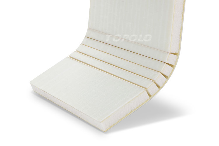 Biegsame Sandwichpaneele mit PET-Schaumkern sind eine kostengünstige und praktikable Lösung. Durch das Schneiden einer Nut mit einer bestimmten Tiefe auf einer Seite der Sandwichplatte kann der erforderliche Biegebereich erreicht werden. Durch die gute Steifigkeit des CFRT-Materials hat die Platte auch nach dem Biegen noch eine extrem hohe Festigkeit.