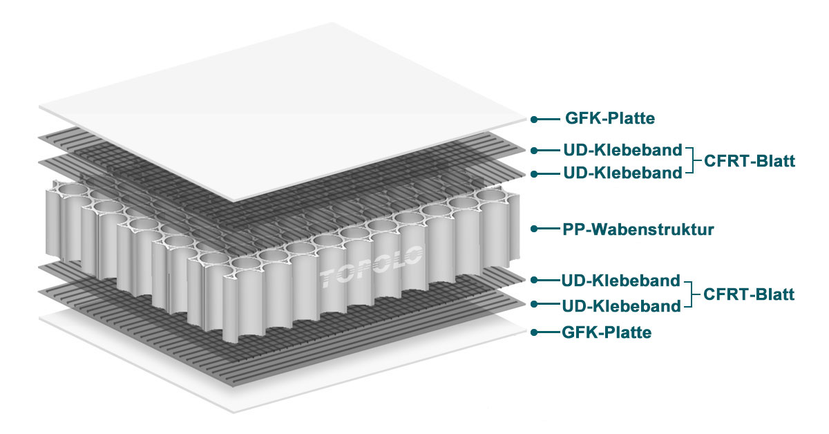 Durch die Kombination von duroplastischen GFK-Platten mit thermoplastischen CFK-Deckschichten als Oberflächenschichten von Polypropylen-Wabenplatten entsteht ein Hochleistungs-Hybridverbundwerkstoff. Diese Struktur bewahrt die hervorragenden Kriechfestigkeitseigenschaften von CFK-Materialien und erhält gleichzeitig die glatte, ästhetisch ansprechende Oberflächenqualität der GFK-Platten.