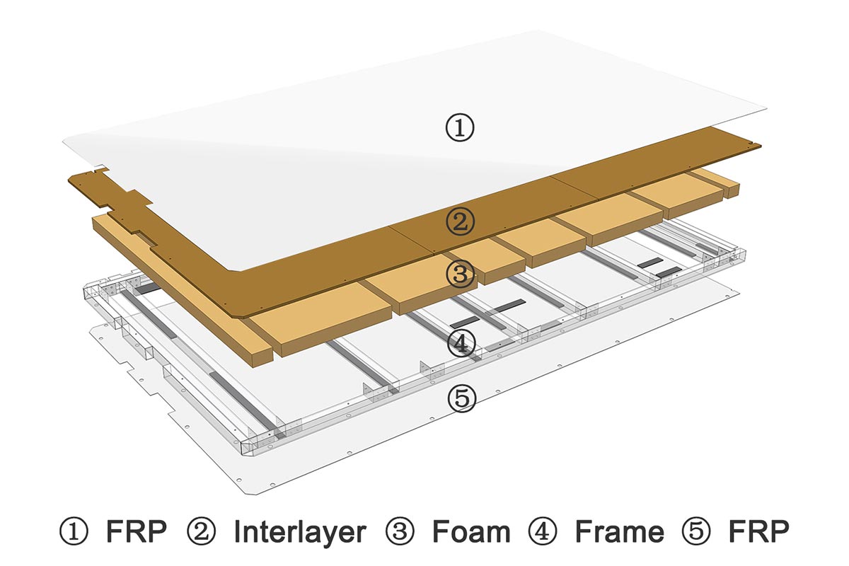 - Die Deckschicht besteht aus wasserdichtem GFK, um zu verhindern, dass die Feuchtigkeit vom Boden des Fahrzeugs in die Box eindringt.