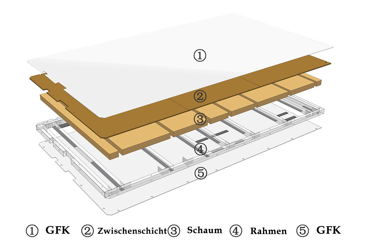 - In das Kernmaterial werden Leichtbaurippen (Hölzer oder GFK-Profile) eingelassen, um die strukturelle Festigkeit des Unterbodens zu verbessern.