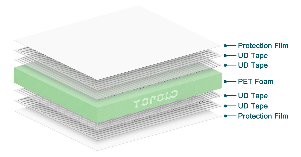 - Oberflächenmaterial: Als Oberflächenmaterial kommen endlosfaserverstärkte thermoplastische Platten (CFRT-Platten) zum Einsatz. Sie werden hergestellt, indem unidirektionale Endlosfaser-Prepreg-Tapes in verschiedenen Winkeln (90°/0°) verlegt werden, wobei die Oberfläche mit einer Polymerschutzfolie bedeckt ist. Dies verleiht den Paneelen einen hervorragenden Verformungsschutz, eine hervorragende Haltbarkeit, Kratzfestigkeit und Wasserdichtigkeit.