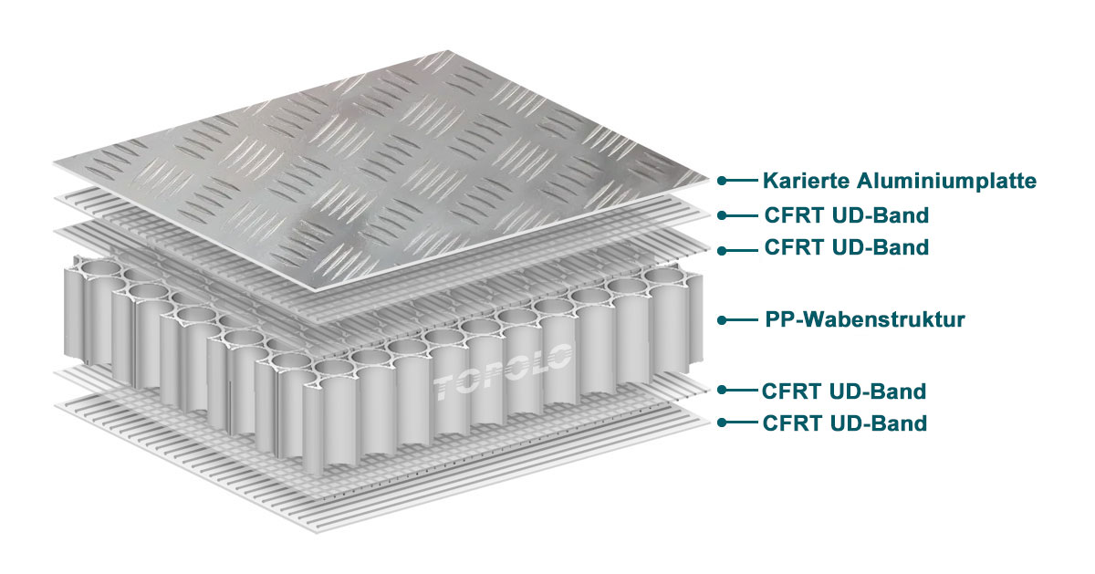 Diese Verbundplatte kombiniert ein geriffeltes, rutschfestes Aluminiumblech mit einem wabenförmigen Kern aus thermoplastischem Polypropylen (PP), die mit einem hochfesten Strukturklebstoff verbunden sind. Sie stellt die perfekte Verbindung der Langlebigkeit von Metall und der leichten Eigenschaften eines Polymerverbundwerkstoffs dar.