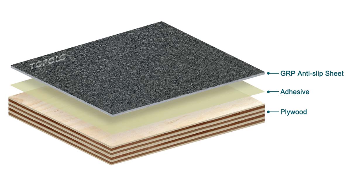 - Sandwichstruktur: GFK-Antirutschplatte + wasserdichtes Sperrholz.