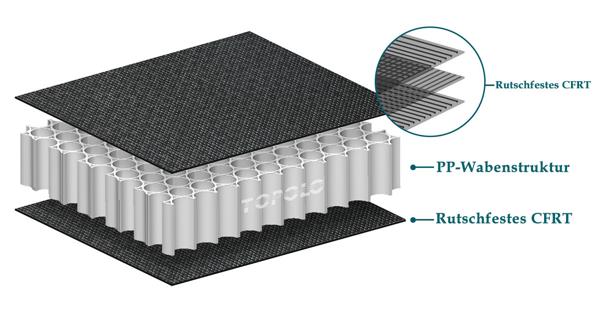 Thermoplastische Polypropylen-Wabenplatten bestehen aus Polypropylen-Wabenkernen und endlosfaserverstärkten thermoplastischen (CFRT) Häuten. Nach dem thermoplastischen Compositing entsteht eine Oberfläche mit einer rutschfesten Textur. Im Gegensatz zu herkömmlichen selbstklebenden Verbundplatten gibt es bei der Verarbeitung von thermoplastischen Verbundplatten keinen Klebstoff. Die Haut und das Kernmaterial werden in einer Heißpresse erhitzt und anschließend abgekühlt und miteinander verschmolzen. Die Eigenschaften von Thermoplasten in Kombination mit der fortschrittlichen thermoplastischen Verbundtechnologie verleihen ihm viele Vorteile wie geringes Gewicht, wasserdicht, langlebig, langlebig, rutschfest, recycelbar und einfach zu installieren.