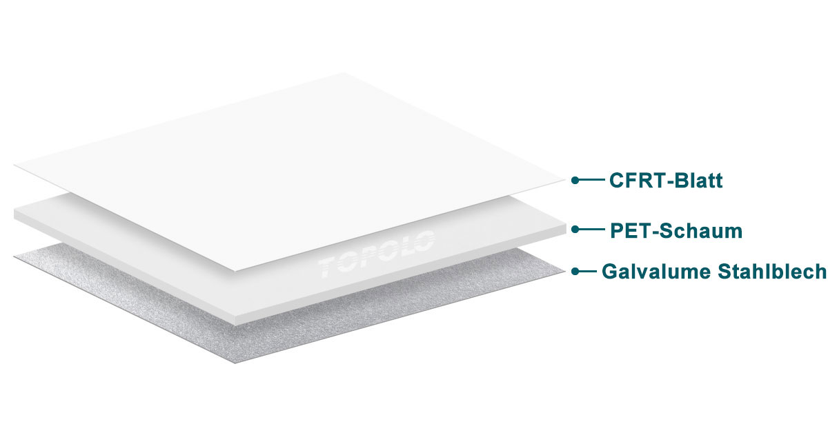 Die Außenhaut der Türverkleidung besteht aus CFRT-Platten (Continuous Fiber Reinforced Thermoplastic), einem Verbundmaterial aus Endlosglasfasern und thermoplastischem Polypropylen (PP). Es bietet eine überlegene Schlagfestigkeit und einen besseren Schutz im Vergleich zu duroplastischen GFK-Platten oder Aluminiumplatten gleicher Dicke.