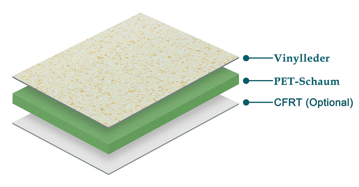 Die Bodenbelagslösung kombiniert eine Vielzahl von Hochleistungsmaterialien, darunter CFRT (endlosfaserverstärkter Thermoplast), Vinylleder und PET-Schaumkern, von denen die CFRT-Platte und der PET-Schaum thermoplastische Materialien sind und zu 100 % recycelbar sind.