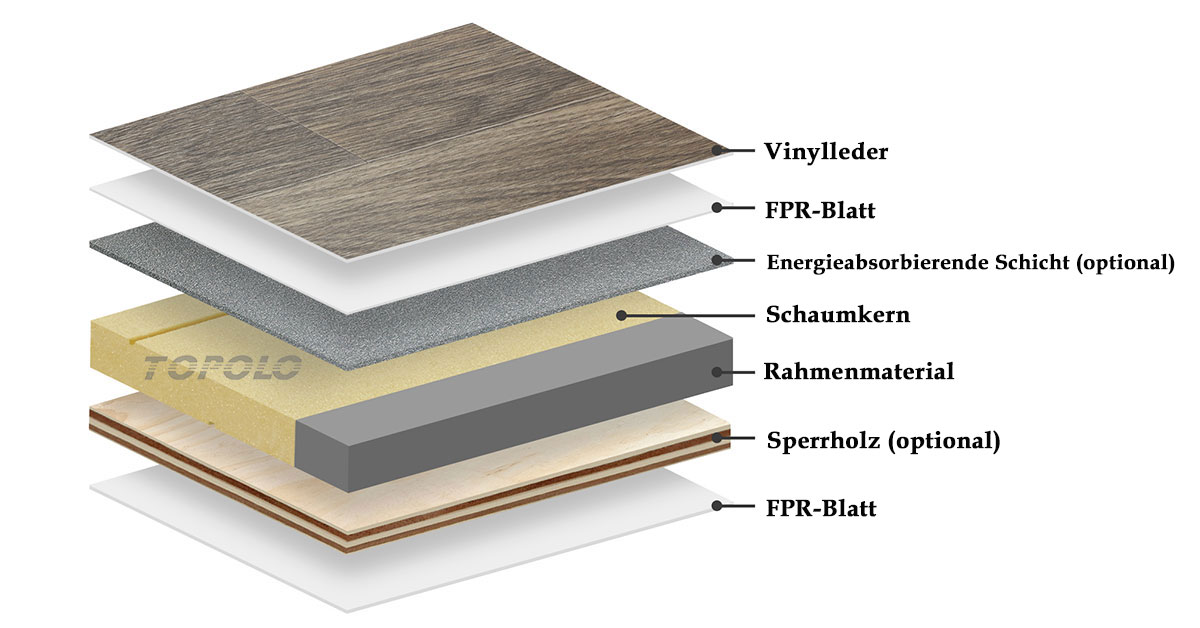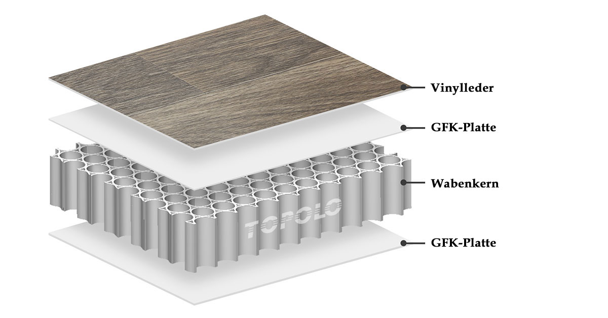 Der Verbundboden für Wohnmobile der TOPOLOGROUP besteht aus einer mehrschichtigen Verbund-Sandwichplatte, die aus Vinylleder, GFK-Platten, Sperrholz, Schaumstoffkern oder Wabenkern- und Rahmenmaterial besteht. Diese Verbundstruktur erhöht nicht nur die Festigkeit des Bodens, sondern reduziert auch effektiv das Gewicht und verbessert gleichzeitig die Haltbarkeit und den Komfort. Für verschiedene Arten von Wohnmobilen können Benutzer je nach Bedarf einen Schaumstoffkernboden oder einen Wabenkernboden wählen.