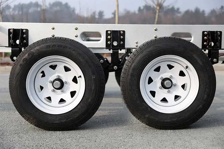 Das Fahrgestell ist ein unverzichtbares Bauteil als Basis für den Einbau des Wohnwagenaufbaus. Das Fahrgestell des Wohnwagens besteht in der Regel aus dem Traktionssystem, dem Rahmen, dem Federungssystem, dem Bremssystem, den Reifen und anderen Teilen. Ein hochwertiges Fahrwerk ist entscheidend für die Fahrsicherheit, Stabilität und den Komfort eines Wohnwagens.
